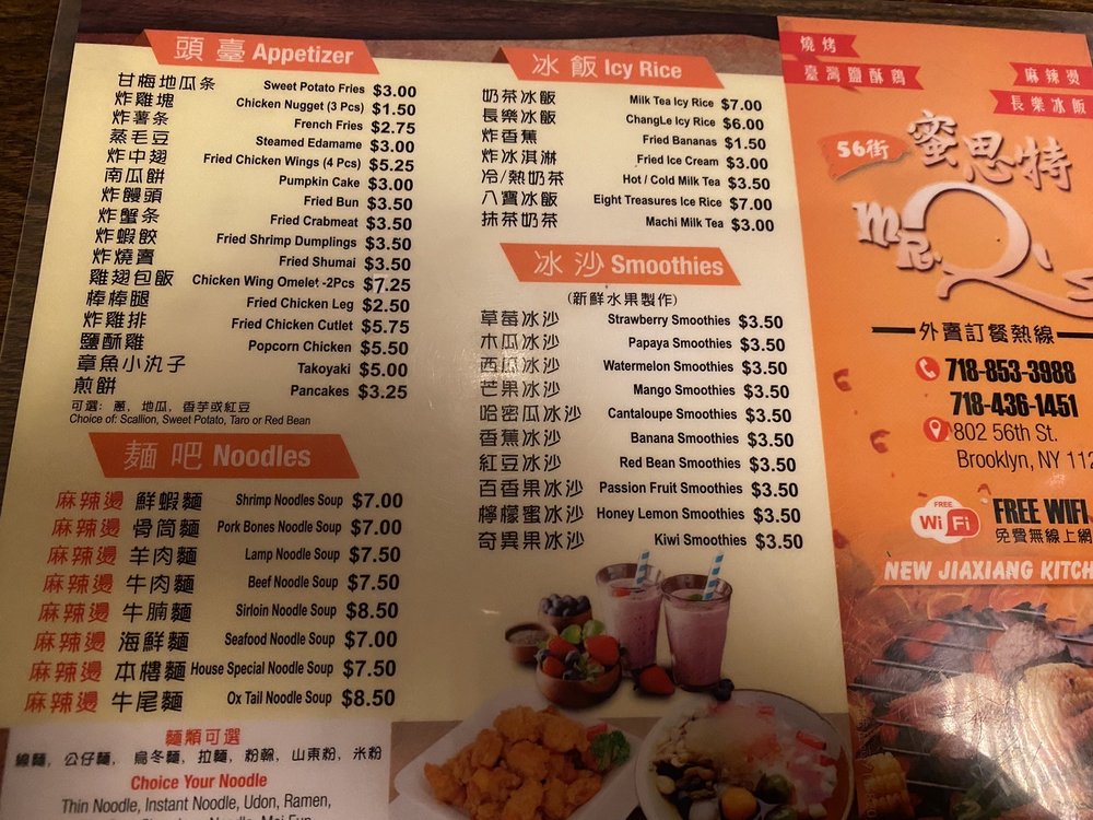 Introducing the menu at Mr Q BBQ Grill, a fast-food Chinese barbeque joint in Brooklyn, NY, offers a diverse and savory selection. From appetizers like fried chicken wings and steamed edamame to hearty noodle soups with various meat options, the menu caters to all preferences. The vegetable skewers on offer range from cauliflower to eggplant, providing a healthy yet flavorful option. Customers rave about the juicy and flavorful skewers, with favorites like bacon-wrapped mushrooms and fried squid impressing many. The cozy atmosphere, quick service, and late-night opening hours make it a popular choice for both quick bites and leisurely meals. Overall, Mr Q BBQ Grill stands out for its delicious skewers, satisfying noodles, and attentive service, making it a must-visit for BBQ enthusiasts.